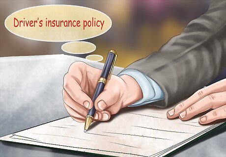 Get the other driver’s information. If you want to be compensated by the other driver, you must get the following information: The other driver’s name and driver's license number, The other driver’s vehicle type and license plate number, The name of the other driver’s car insurance company, and The other driver’s insurance policy number.