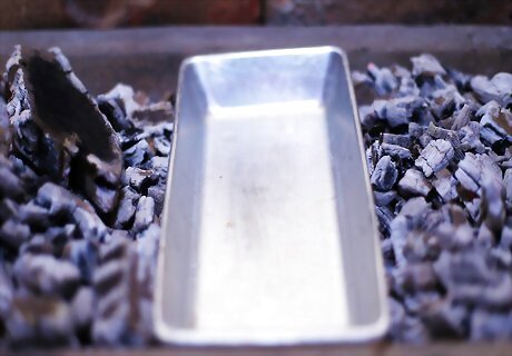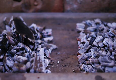 Create a double-bank fire if you're using a charcoal grill. To make a double-bank fire, move the charcoals to either side of the firebox to leave room in the middle for a drip pan. Move the charcoals after they've turned ashy and the grill has come to temperature. A good grill has a hinged cooking grate. Instead of removing it completely, you can just lift a hinged grate to move charcoals or insert a drip pan. Whether you have to lift your grate or take it off of the grill completely, be careful not to burn yourself. Use tongs and insulated cooking gloves to prevent burns.
