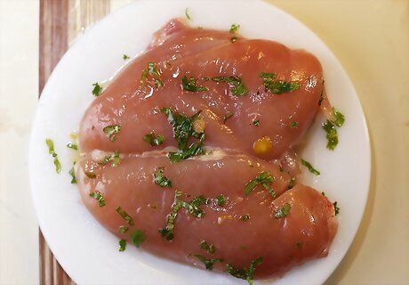 Loosen the skin and rub half of the butter mixture all over the breast. Use your fingers to carefully loosen a section of skin from the breast so you can access the flesh beneath it. Rub half of your butter mixture under the skin and all over the outside of the breast. Reserve half of the butter mixture to use later.