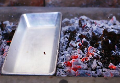 Place the drip pan under the cooking grate. You can use a large disposable foil pan to catch drippings or purchase a drip pan designed for your grill. If you have a charcoal grill and made a double-bank fire, place the pan between the charcoals. If you have a gas grill, place the drip pan under the cooking grate, then turn off the burners that sit under the drip pan. If your gas grill has a designated spot for a drip pan, place it there. Otherwise, place it over the center of the grill under the cooking grate. If you have a grill with a built-in drip pan, check it to make sure it's clean, as excess grease can cause flare-ups. Whether your grill is gas or charcoal, trim your foil pan's sides if it's too tall to fit between the bottom of the firebox and the cooking grate. Never use a drip pan to support the cooking grate.