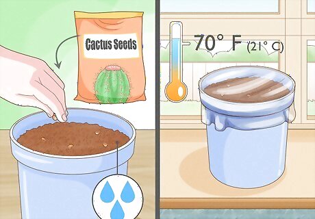 Grow cacti from seed. While this method is not difficult, it can be time-consuming to see results. Cactus seeds could take up to a year to germinate and several years for the young cactus to begin to flower. Unless you have a heated greenhouse, it's best to sow cactus seed in the late spring. Seed companies often offer many mixed varieties of cacti seed. Use clean sterilized shallow pots to begin your seeds. Use a mixture of potting soil and sand. Place the seeds on the soil and cover them with just enough sand to anchor them. Keep in mind that cactus seeds don't germinate well if they have been sown too deeply. Dampen the soil enough to wet the seed. When the soil dries out completely, use a mister to keep it moist. Do not over water. Cover seeds with glass or plastic wrap and be sure to wipe away any condensation that may form. When seedlings appear, remove the cover. Carefully prick apart any seedlings that have grown together. Place the seedlings in light, but not in direct sunlight. Keep temperatures around 70 degrees F (21 degrees C).