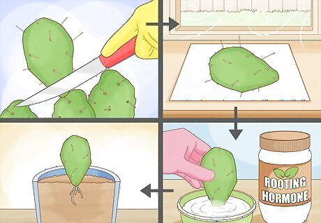Propagate cacti from cuttings or offshoots taken from mature cactus plants. Allow the cuttings to dry and its cut edge to heal for a couple of weeks. Place the healed cutting into a rooting medium formulated to encourage roots to grow. Make certain the cutting is right-side up. If placed upside down, it will not grow. After a week, begin to water the cutting sparingly.