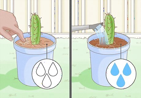 Water when the soil is dry. Let the soil your cactus is planted in dry out completely before you water it. Simulate natural conditions in the desert by watering well but infrequently in much the same way as that of an infrequent desert thunderstorm. Over-watering will cause your cactus to rot.