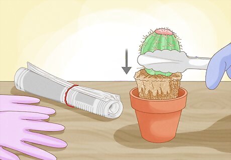 Use tongs to place a small spiny cactus into your pot or rolled newspaper and sturdy gloves to plant a larger cactus.
