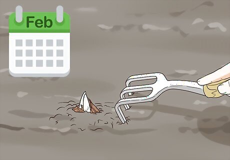 Remove the mulch from your crocuses in late February. Discard or compost surface mulch so your crocuses can begin to shoot up through the ground. Crocuses are early spring flowers and will typically emerge some time in late February or early March depending upon your local climate.