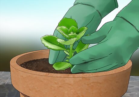 Transplant established herbs into a larger pot. Dig a hole the same size and depth of the root ball. Place the herb into the hole so the top of the root ball is even with the soil. Fill in any extra space with your potting mix and pat it so the soil contacts the root ball evenly. Place herbs strategically in the pot. Keep shorter creeping herbs near the edges, while taller bushier herbs should be kept in the back or middle of the pot. Label your individual herbs with popsicle sticks in the soil or garden labels.