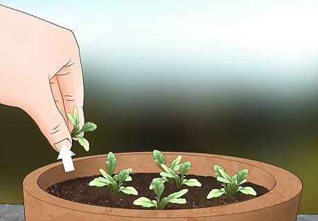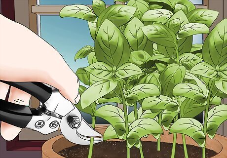 Thin out any weak seedlings with gardening scissors. Wait until your herbs have 1 or 2 sets of true leaves before thinning them out. Snip herb seedlings that look withered or leggy to reduce the crowding in your pot. Don’t pull them up by hand or else you could damage the roots of your healthy plants. Thinning out seedlings helps reduce competition for water and nutrients.