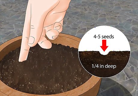 Plant the seeds ⁄4 inch (6.4 mm) deep in the soil. If you’re growing your herbs from seeds, make a hole ⁄4 inch (6.4 mm) deep for each type of herb you’re planting. Sprinkle 4-5 seeds of one herb into a hole before covering them again. Repeat this for each herb you plant. Pair herbs together that require similar amounts of water and sunlight throughout the day. This ensures your plants all survive. Look on the packaging for the seeds or plant to see what the sun and water requirements are. Sage, bay, thyme, and rosemary are common herbs to grow together in the same pot. Check if your herbs are perennials or annuals. Separate them into different pots. Common perennials are oregano, fennel, and mint. Some of the common annual herbs are basil, dill, and cilantro.