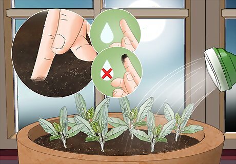 Water the seeds and fill in any excess soil. Use a watering can to gently pour water over your herbs until the soil is damp. If you notice the soil level go down after watering, add more soil so it’s level again. Put your finger in the soil up to the first knuckle. If the soil feels dry, keep watering the herbs.