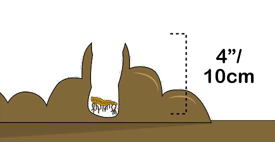 Plant each rhizome in a 4-inch (122 cm) hole. Dig one 4-inch deep hole in each soil mound. Plant the rhizomes horizontally, with the root side down. Mound soil over the rhizomes and loosely pack it down, then cover with straw or a light mulch to inhibit weed growth.