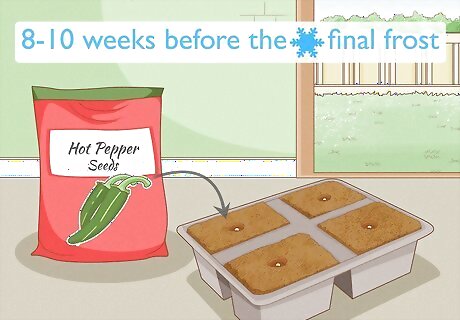 Begin the process 8-10 weeks before the final frost of the season. Except in some hot climates, pepper seeds won’t grow properly if you plant them directly into the garden soil. They need to grow for a while indoors in a controlled environment. The timeline of this varies, because the end of winter can be tricky to predict. Expect to start the seeds around the end of January or the beginning of February. If your area has especially mild winters, or you live in a warm climate, you have more freedom when it comes to when you must start the plants.