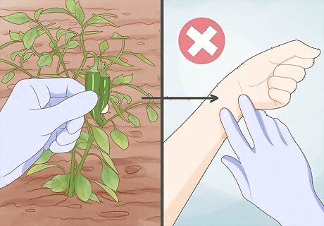 Avoid touching your skin after you touch the peppers. Even wearing gloves, you are at a risk for transferring the pepper oil to your skin. Make sure that you don’t rub the gloves on your skin, especially anywhere on your face or around your eyes.