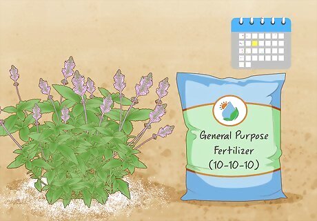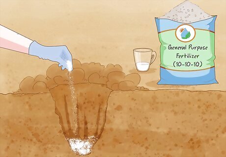 Add a general-purpose fertilizer to the soil. Before sticking your salvia bush in the ground, fertilize the soil you’ll be planting the salvia in. Use a 10-10-10 general-purpose fertilizer. Scoop about 1/4 cup (32 g) of loose, dry fertilizer into the hold you’ve dug. Use the blade of your shovel or your hands to work the fertilizer into the soil. You can purchase fertilizer at any nursery or home-improvement store.