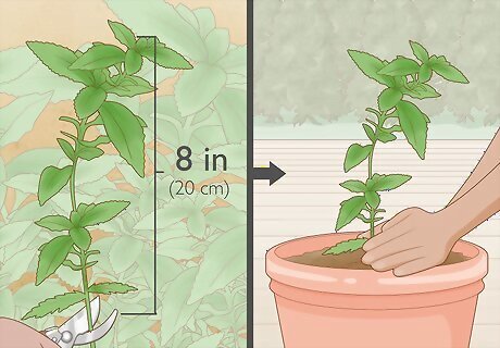 Take salvia cuttings in spring when bushes are covered in new growth. If you’d like to propagate new salvia bushes from bushes that you’re already growing, try taking cuttings. Late in the spring months, trim off an 8 in (20 cm) long section of a non-flowering salvia stem. Make the cut just below the node where 2 leaves grow out from the stem. Snip off the lower leaves and stick the end of the cutting into a small pot full of damp cutting compost. After 3 weeks in the cutting compost, plant the cutting in a pot with well-draining soil. Purchase cutting compost at a home-improvement store or plant nursery. Cutting compost is rich in nutrients that cuttings need to grow.