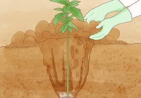 Plant the bush so the top of its roots are level with the soil surface. Pull the salvia plant out of whatever container it’s currently in. Lower it into the ground until the top of the bush’s root bundle is level with the surface of the soil. Carefully fill in the soil around the plant so that it remains in place. Use your hands to pack down the soil around the plant. The soil should be relatively loose so that water can permeate it. To make sure that the top of the root bundle is level with the soil’s surface, you may need to place some of the soil you dug out back into the hole.