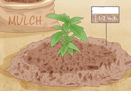 Add 1–2 inches (2.5–5.1 cm) of mulch on top of the salvia’s roots. Use a rake to spread a generous layer of mulch around the base of the salvia bush. Mulch traps moisture from the soil and prevents it from evaporating. This allows the salvia bush’s root system to absorb all of the water that it needs to survive. If you don’t have mulch on hand, purchase a bag at a plant nursery or a landscape-supply company. Or, you can make your own mulch from leaves, bark, tree branches, and other organic materials around your home.