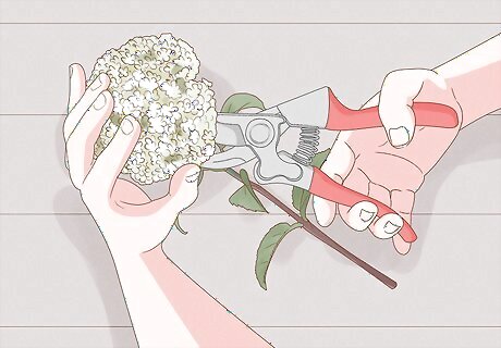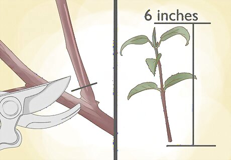 Cut the branch 6 inches from its end. Use a sharp pair of gardening shears to cleanly cut a 6-inch length of branch. Make sure that the branch has at least two sets of leaves along its length. Try to make the cutting in the morning before the sun comes up to ensure that the shoots are well hydrated. Even if you only want to end up with one snowball tree, make several cuttings. Because cuttings don’t have a 100% success rate of blooming into plants, it’s better to use two or three cuttings than to put all of your hopes on just one.