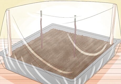 Cover the cuttings with a plastic bag. Place the tray into a large plastic bag, tenting the top so that the bag doesn’t touch the top of the cuttings. The plastic bag will ensure that water doesn’t evaporate away from the cuttings as they start to take root. If you are having trouble keeping the plastic bag from touching the tops of the cuttings, tape tall straws onto the corners of the seeding tray and settle the bag on top of the straws. Check the tray every now and then and water the soil when it is dry.