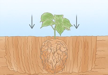 Place the bulb of the sapling into the hole. Carefully take the snowball sapling out of its container. Use your fingers to gently loosen the visible roots of the bulb away from the sides so that they stick out from the bulb. Then lower the bulb into the hole. Make sure that the point of the sapling where the trunk meets the roots is 1 ½ to 2 inches above ground level.