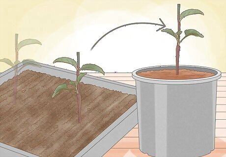 Transplant the cuttings into pots. After about one week from time you removed the plastic bag, transplant the cuttings into small pots filled with potting soil. Do this by gently lifting the plants from the tray, making sure not to break any of the roots. Place the plants into a small hole in the potting soil, then press soil around the base of the cuttings. Water evenly to keep the soil moist. If more than one cutting took root, transplant them into separate pots. If you wish, you can transplant the snowball trees into the garden two to three weeks after you transplant them into the pots. Make sure not to forgo the potting step before transplanting into a garden.