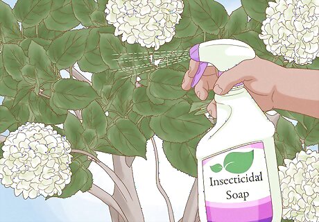 Keep an eye out for common pests. From time to time, your snowball tree may fall prey to insect or rodent infestations. Here are some pests you should watch for: Tiny, sucking insects like aphids, mites, and scales. To treat, spray your trees with insecticide soap. If you’re using concentrated soap, dilute it to one teaspoon per pint for mild infestations, and four teaspoons per pint for severe infestations. Root weevils, which look like white grubs with brown heads. To get rid of these pests, drench the foliage in insecticide soap two to three times per week. Repeat every three weeks until the weevils are gone. Viburnum leaf beetle eggs, which look like rows of tiny caps on the underside of leaves. Prune infested twigs and leaves. To prevent infestations, spray the plant in early spring with organic, pyrethrin-containing pesticides.