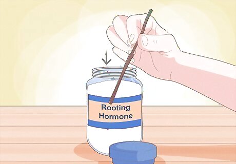 Dip the branch into rooting hormone powder. Rooting hormone powder betters the chances that the cutting will bloom into a plant. Pour the powder into a small bowl, and then dip the branch into the bowl, making sure that the powder covers the leaf nodes where you peeled away the leaves.