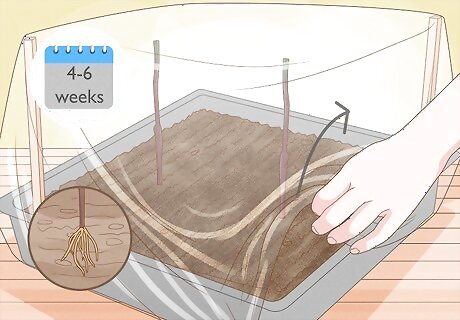 Remove the plastic bag when the cuttings starts to root. After about four to six weeks, the cuttings should start to grow roots. To check for roots, gently brush away the potting soil from the base of the plant, or very gently tug at the plant to see if there is some resistance from the roots. When you notice roots, remove the plastic bag and water regularly to keep the soil moist.