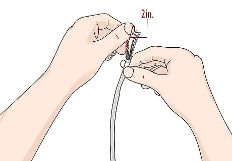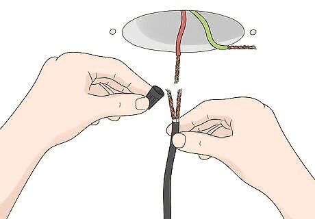 Strip the end of the cable about 2 inches (5.1 cm) to expose the wires. Use a wire stripper or a knife to cut back the sheathing at the end of the light cable to expose the 3 wires. Separate the wires and then strip back about 1 inch (2.5 cm) of the sheathing of each of them to expose the metal wires inside so you can connect them to the electrical terminal in the ceiling.Tip: Twist the ends of each wire so the small metal wires are neat and aren’t frayed and will be easier to connect.