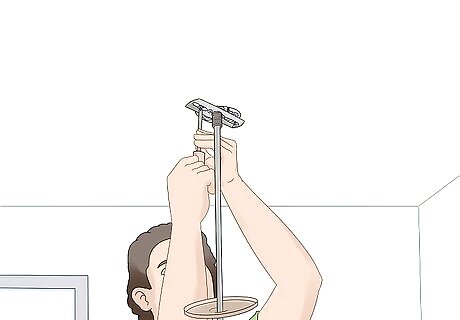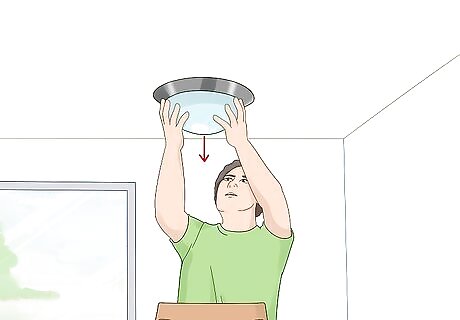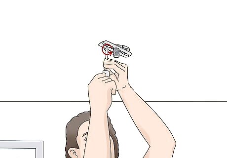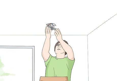 Take down the old light fixture if there is one. If there’s a fixture installed, take off the screws or nuts holding the cover in place, remove the cover, and unscrew the lightbulb. Then, use a screwdriver to remove the screws holding the bracket or crossbar and use your hands to unscrew the plastic wire connectors holding the wires together. Untwist the wires and remove all of the pieces of the fixture from the ceiling. Carefully untwist the wires so they aren’t frayed or damaged. You should be left with an empty hole in your ceiling with 3 wires hanging out of it.