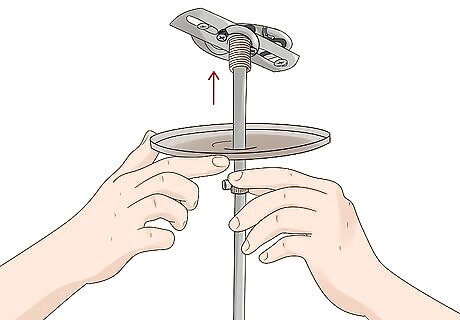 Hold the fixing plate against the ceiling with the wires in the central hole. Take your Nelson lamp fixing plate from the packaging and press it against the ceiling where you plan to install it. Thread the wires through the opening in the center so the plate is flush against the surface of the ceiling. Keep the fixing plate held against the ceiling.