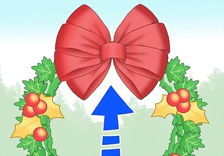 Add a bow to the top of the wreath for a nicer finish, if desired. If you have any ribbon leftover on the spool, you can tie it into a fancy bow, then hot glue it to the front of the wreath, right over the wrapped ribbon. You can also buy a pre-made matching bow from the store, and use that instead. The ribbon and floral departments of arts and crafts stores often sell pre-made bows. Alternatively, you can place the bow at the bottom of the wreath.