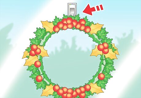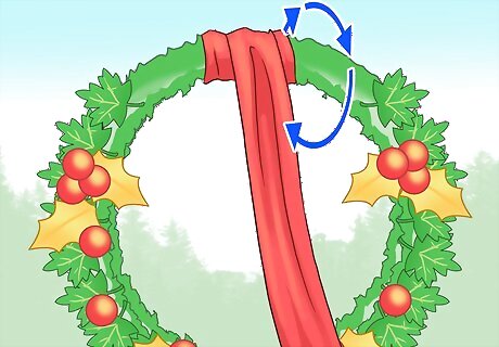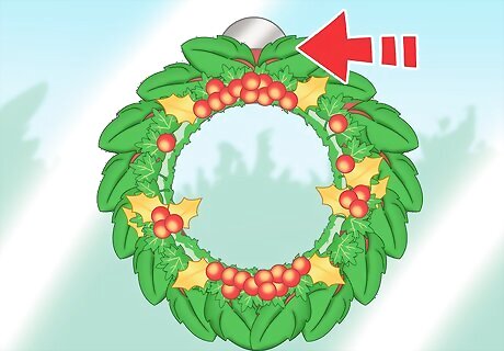 Hang the wreath over the hook. If the wreath is too thick for the hook, thread some ribbon through it first, then tie both ends together to make a loop. Slip the ribbon loop over the hook.