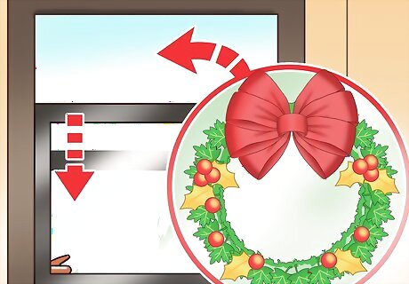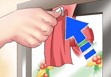 Adjust the length of the ribbon, then pin it to the window frame. Pull down on the ribbon until the wreath is hanging where you want it to be. Push a thumbtack or pushpin through the ribbon and into the frame. Make sure that you stick the pin to the side of the frame. If you pin it to the very top, it will get in the way when you close the window. If you have vinyl or metal window frames, tie a large knot into the ribbon instead.