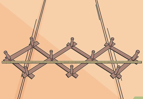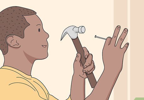 Hammer a finishing nail into each end of the line. Take a finishing nail and hold it against the end of the line on one side. Tap it into the wall with a hammer so it’s slightly angled up. Leave the end sticking out so the hanger can hook over it. Repeat that for the other nail. A finishing nail is a small, thin nail used for light jobs like hanging frames. You can get them at hardware stores. Accordion racks are light, so you don’t have to worry about finding studs to hammer into. You can erase the line after you hammer the nails down.
