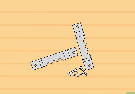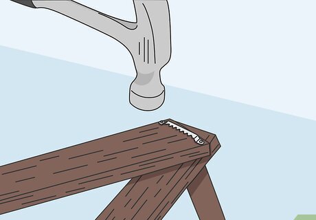 Hammer 2 nails into each hanger to attach them to the rack. Each hanger requires 2 small nails that come in the package. Hammer a nail through each hole in the hangers to attach it. Confirm that each hanger is straight before hammering the nails. Since the nails are very small, you can hold them with needle-nosed pliers to avoid hitting your fingers while you hammer.