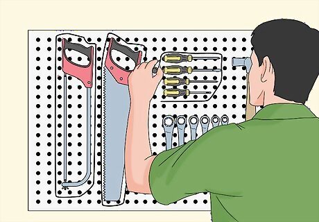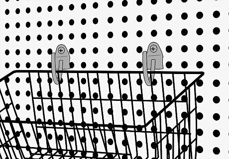 Hang wire baskets from small hooks to hold other non-hangable items. Get some narrow, rectangular baskets from the kitchen or office section of a store. Pop some short hooks onto your board, then hang the basket from them. Fill the basket with non-hangable items, such as screwdrivers, pliers, and wrenches. If you want to store small items, such as screws, line the basket with fabric or paper first.