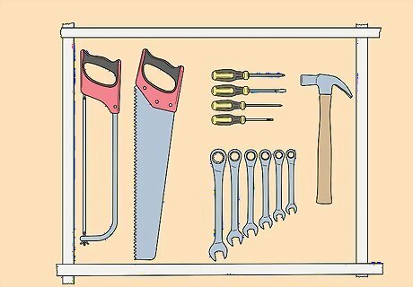 Arrange the tools in the box how you want them to hang on the board. If you have a lot of tools, consider grouping them based on type first. For example, you could place all of the screwdrivers into 1 group, and all of the saws into another. Play around with the positioning. Rather than keeping everything in neat, horizontal rows, try placing some items in vertical or diagonal rows.