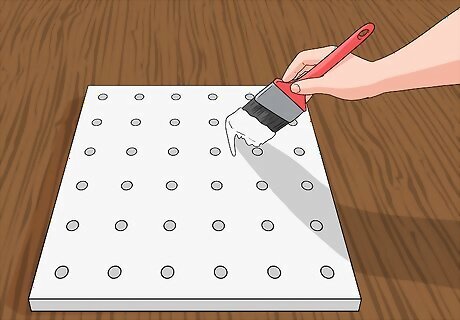Paint the pegboard if you want to change its color. Use a paint roller to apply 1 coat of paint primer. Let the primer dry, then apply 1 light coat of glossy or semi-glossy paint in your desired color. Let the paint dry, then apply another coat if the first coat is too sheer. If any paint collects in the holes, clear it away with a wooden skewer. Latex paint will work just fine for this, but you can also use spray paint.