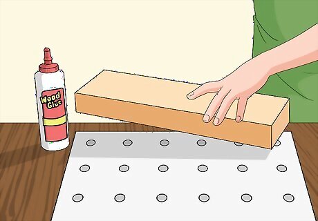 Glue the horizontal planks to the top and bottom edges of the board. Flip the pegboard over so that the back is facing you. Coat the horizontal planks with wood glue, then set them on top of the pegboard, making sure that they align with the top and bottom edges. Secure the planks to the pegboard with clamps until the glue dries. Because you cut these planks shorter, they should fit perfectly between the 2 vertical side planks. If you cut an additional panel for the middle of the board, you should secure it with glue as well. Weigh the plank down with something heavy until the glue dries.