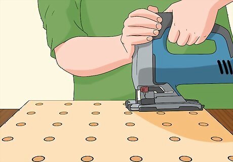 Cut the pegboard smaller, if needed, but leave a border around it. If you cut your pegboard to the exact size you want, you may end up cutting through the peg holes, which won't look as nice. Instead, cut the pegboard so that you have an even border on all 4 sides of the board. For example, you could leave a 1 in (2.5 cm) border around the holes on all 4 sides of the board. Your pegboard may end up being a little smaller or larger than you want it to be, but it will look nicer.