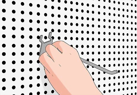 Reinforce hooks with pegboard clips, if needed. Sometimes, hooks sit a little too loose in their peg holes. If you find that your hooks wobble too much as you move your tools around, you can tack them down with pegboard clips. Alternatively, coat the prongs on your hooks with hot glue before you pop them into place.