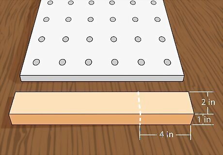 Cut 2 1 by 2 in (2.5 by 5.1 cm) planks to the height of your board. Measure the height of your pegboard first. Next, choose 2 wooden planks that are 2 inches (5.1 cm) wide and 1 inch (2.5 cm) thick. Use a saw to cut them to the same height as your board. Adding these planks is important, as it will help secure the board to the wall as well as allow you to insert the pegs. If your board already has these planks, skip this section. A circular saw will work just fine for this, but you can also use a jigsaw or a handsaw. The height of your board won't always be the longest side. For example, if you choose to hang it landscape style, the height will be the shorter edge.