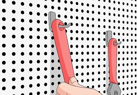 Hang your tools on the hooks. Most tools will have some sort of loop at the top so that you can hang them. If they don't have hanging loops, read on to the next section to find other ways in which to hang your tools. For example, you can clamp a binder clip onto a canvas pouch, then slide the binder clip over a peg hook.