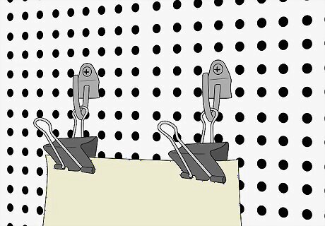 Clip non-hangable items onto binder clips, then slide the clips onto peg hooks. Not all tools have hanging loops. Instead of stuffing them into a tool box, clamp a binder clip over them. Next, slide the binder clip's loops over a peg hook on your board. This works best for flat items, such as canvas pouches and clipboards. It's not recommended for thick items, like pliers or screwdrivers.
