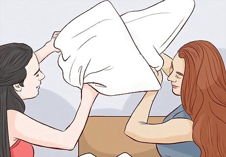 Have a pillow fight. Grab a pillow and blanket for shield and hit each other as hard as you can.