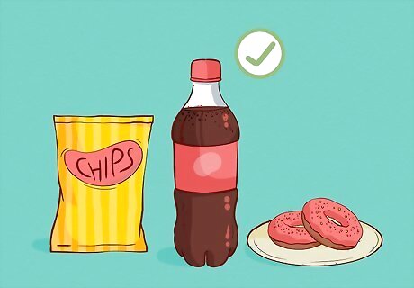 Decide what food, snacks and drinks you'll have at the sleepover. Are you going to buy the food or make it yourself? Work this out well in advance. You could even consider making or baking food as one of the fun activities you do together. Snacks aren't just for eating at movies, some will help you all to stay up late too. Have chips, sodas and sugary treats to help you not fall asleep. Soda has caffeine, candy has the sugar. But be warned! While eating candy is fun, and will help, your sugar could crash, which means that you will get really tired, and basically fall asleep.