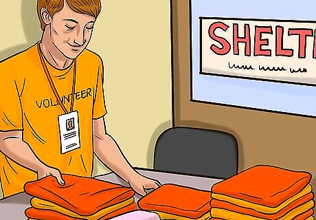 Offer a homeless shelter your services. Homeless shelters have a variety of volunteer positions. Help handout clothing, food, and personal items. You can also help prepare meals at shelters. Call a homeless shelter in your area and ask about their volunteer opportunities. If you have a skill, like writing or drawing, see if you can offer activities or free instruction at the shelter.
