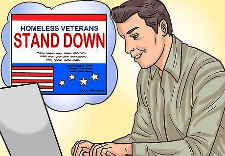 Volunteer at Stand Down events. To find out about Stand Down events in your area, visit the National Coalition for Homeless Veterans’ website. The website contains a list of Stand Downs that are currently operating in different states in the U.S. Call the contact person for that program to find out more information about an upcoming event. Stand Down events are 2 to 3 day events that provide homeless veterans with food, clothing, healthcare services, personal hygiene services, housing and employment referrals, and benefits counseling.