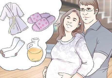 Gather supplies. Make sure you have all the necessary supplies to make the birthing experience as positive as possible. You can have a maternity bag or suitcase. Don't just take stuff for your wife and the baby, bring some things for yourself as well. It is best to pack much of this in advance, so that it is ready before your wife goes into labor. Have you maternity bag ready at least two weeks in advance. For Her: Oil for massage, but be cautious with scents A gown, slippers, and robe if she prefers them to hospital clothes Rolling pin or camper’s ice for pressure and cold on lower back Warm socks Relaxing music Personal focal point (a picture, flowers, a figurine) for her to focus on during contractions Favorite juice or electrolyte-balanced beverage (such as Gatorade) in a cooler Cosmetics Toiletries Her favorite snacks Nursing bras Money for incidentals Going-home clothing (which should still be maternity clothing) For you: Copy of the Birth Plan Watch with a second hand Grooming supplies (toothbrush, breath freshener, deodorant, shaver) Snacks and beverages (consider you wife may be very sensitive to the smell of your breath) Change of clothes Swimsuit so you can accompany the mother in the shower Paper and pencil Reading materials, or handwork, for slow times when the mother does not need your help Phone numbers of people to call during or after labor Camera (still or video) For the baby: Diapers, Receiving blanket Underclothing Outerwear (hat, warm clothes) Crib-sized blanket Car seat For the trip to the hospital: Full tank of gas Blanket and pillow in the car