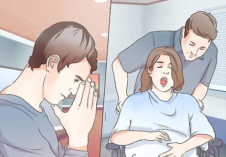 Leave it to the professionals. There comes a point during most labors when a father-to-be needs to take a step back. Delivery is way outside of most fathers' league. Depending on the means by which you choose to birth your child, the father may still be allowed to be with his wife during delivery. Ask to remain with your wife as long as you're capable. Do not abandon your wife in the later stages of labor if you do not have to. In some places, though not in the U.S., fathers are not allowed in the delivery room. If the mother is having an emergency cesarean under general anesthesia, then you will need to leave the delivery room.
